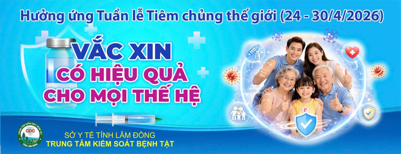 Tuần lễ Tiêm chủng Thế giới 2026 được gắn với chủ đề “Vắc xin hiệu quả cho mọi thế hệ” nhằm kêu gọi nâng cao nhận thức của cộng đồng về vai trò của vắc xin. Thông điệp được nhấn mạnh: Vì sức khỏe của trẻ và cả gia đình, cha mẹ hãy chủ động đưa trẻ đi tiêm chủng đầy đủ, đúng lịch – bao gồm cả các vắc xin trong Chương trình Tiêm chủng mở rộng và các vắc xin dịch vụ cần thiết.