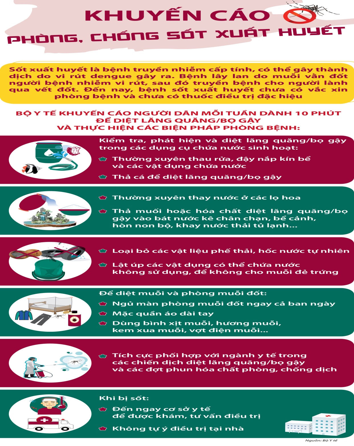 - Hàng tuần thực hiện các biện pháp diệt loăng quăng/bọ gậy bằng cách thả cá vào dụng cụ chứa nước lớn; thau rửa dụng cụ chứa nước vừa và nhỏ, lật úp các dụng cụ không chứa nước; thay nước bình hoa/bình bông; bỏ muối hoặc dầu hoặc hóa chất diệt ấu trùng vào bát nước kê chân chạn.