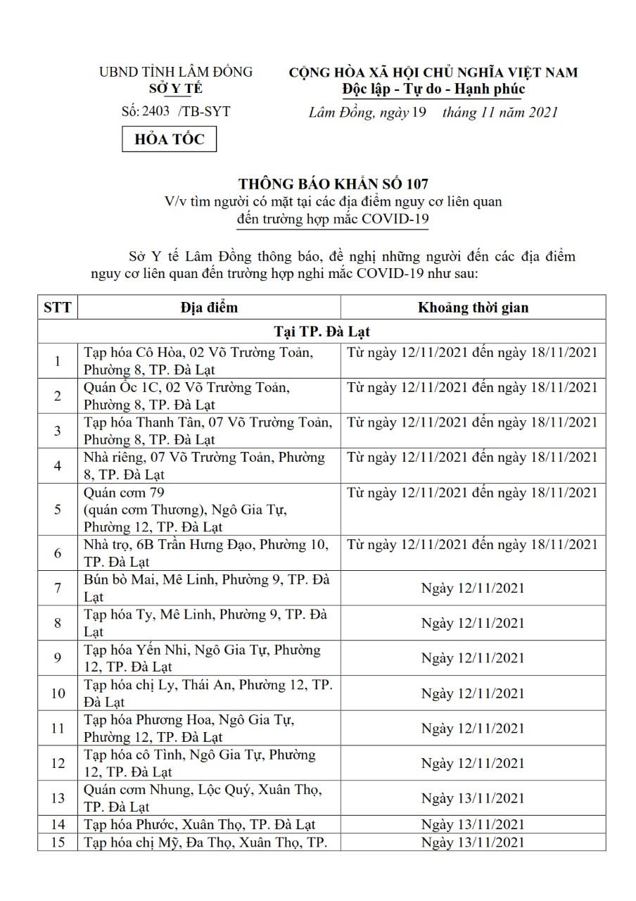​​​​​Sở Y tế Lâm Đồng ban hành văn bản số 2403/TB-SYT ngày 19/11/2021 về việc tìm người có mặt tại các địa điểm nguy cơ liên quan đến trường hợp mắc COVID-19