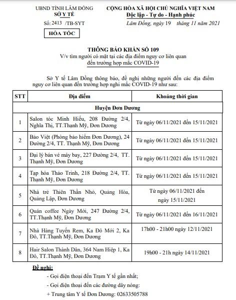 ​​​​​Sở Y tế Lâm Đồng ban hành văn bản số 2413/TB-SYT ngày 19/11/2021 về việc tìm người có mặt tại các địa điểm nguy cơ liên quan đến trường hợp mắc COVID-19