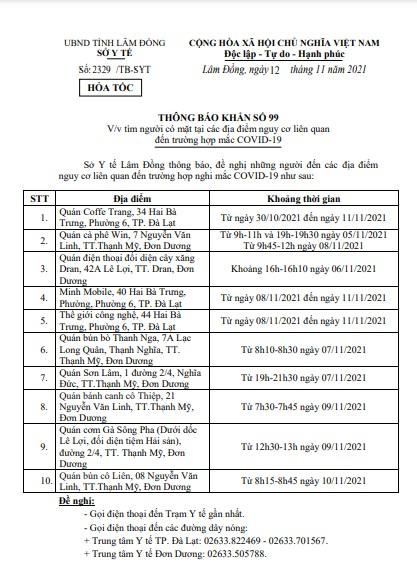​​​​​​​Sở Y tế Lâm Đồng ban hành văn bản số 2329/TB-SYT ngày 12/11/2021 về việc tìm người có mặt tại các địa điểm nguy cơ liên quan đến trường hợp mắc COVID-19