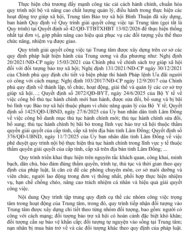 TRUNG TÂM BẢO TRỢ XÃ HỘI BÌNH THUẬN XÂY DỰNG, BAN HÀNH VÀ TRIỂN KHAI THỰC HIỆN QUY ĐỊNH VỀ QUY TRÌNH GIẢI QUYẾT CÔNG VIỆC NHẰM NÂNG CAO HIỆU QUẢ CẢI CÁCH HÀNH CHÍNH TẠI ĐƠN VỊ Ngày đăng: 17/04/2026 - 10:00 Chia sẻ: | In bài viết