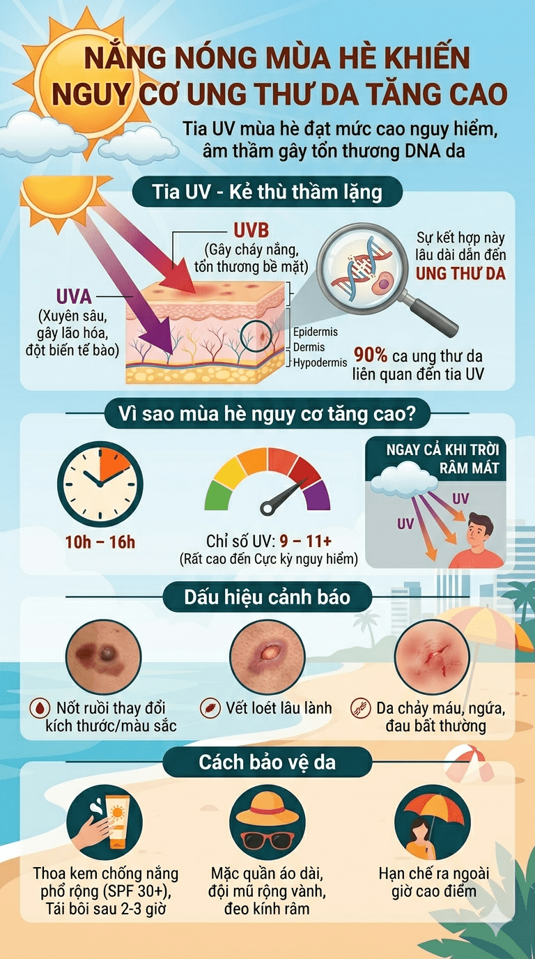 Ung thư da là bệnh có thể phòng tránh nếu chủ động bảo vệ da khỏi tia UV. Tuy nhiên, sự chủ quan trong mùa hè - thời điểm tia UV đạt đỉnh - lại chính là nguyên nhân khiến nguy cơ gia tăng nhanh chóng.