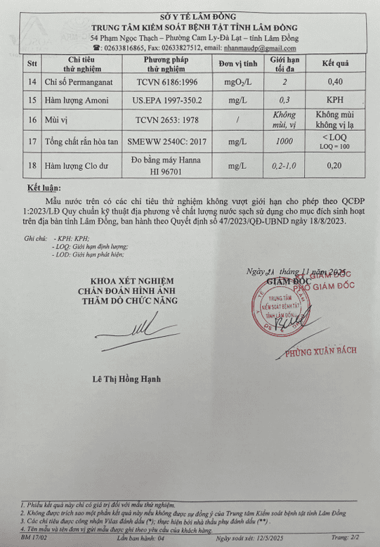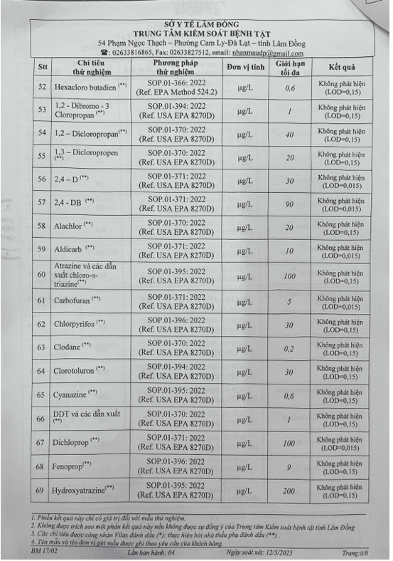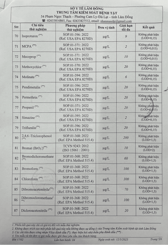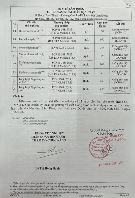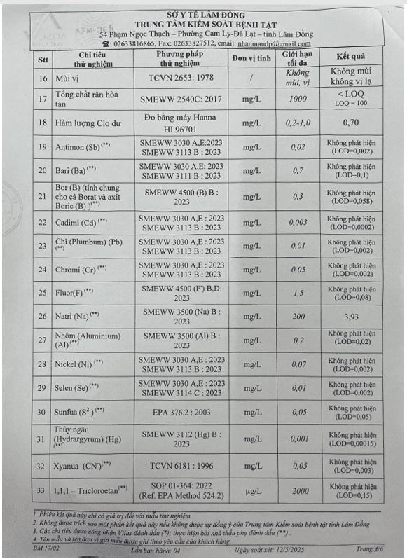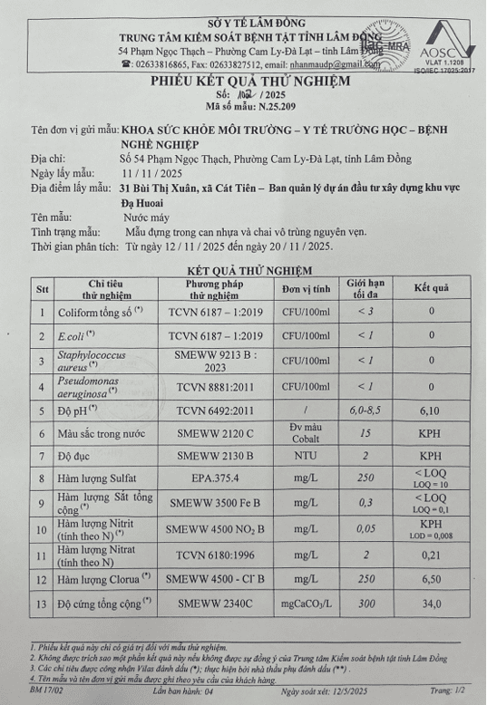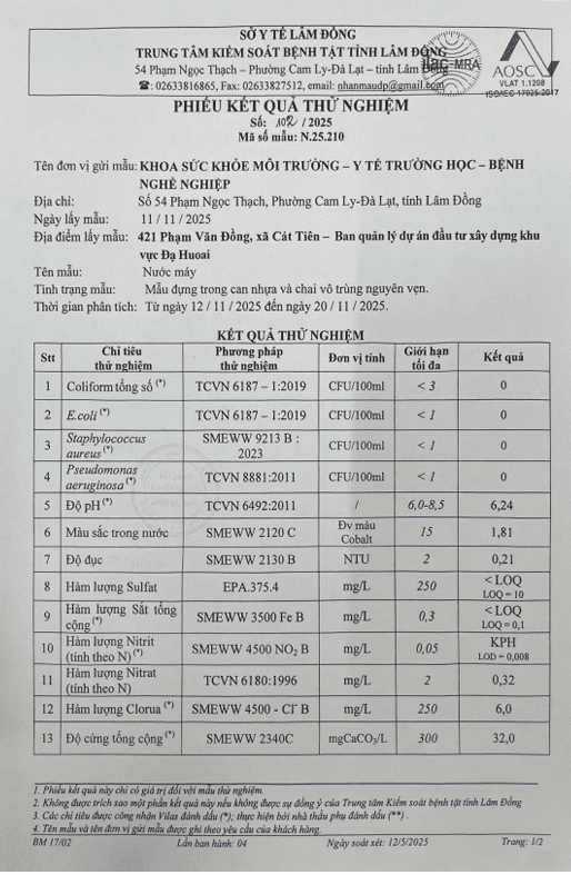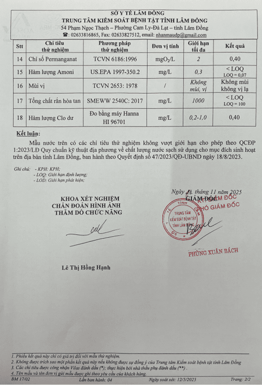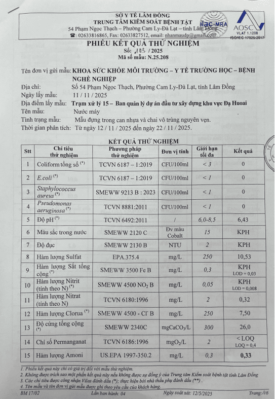 Kết quả ngoại kiểm chất lượng nước sạch sử dụng cho mục đích sinh hoạt tại Công ty Cổ phần Cấp thoát nước Lâm Đồng năm 2025