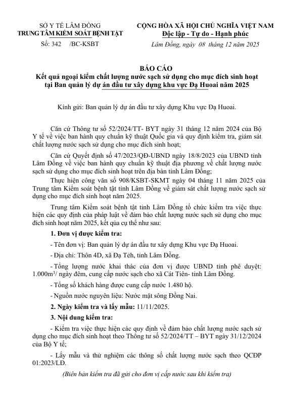 Cập nhật lúc: 10:33 - 08/12/2025 Báo cáo Kết quả ngoại kiểm chất lượng nước sạch sử dụng cho mục đích sinh hoạt tại Ban quản lý dự án đầu tư xây dựng khu vực Đạ Huoai năm 202 | Giới thiệu