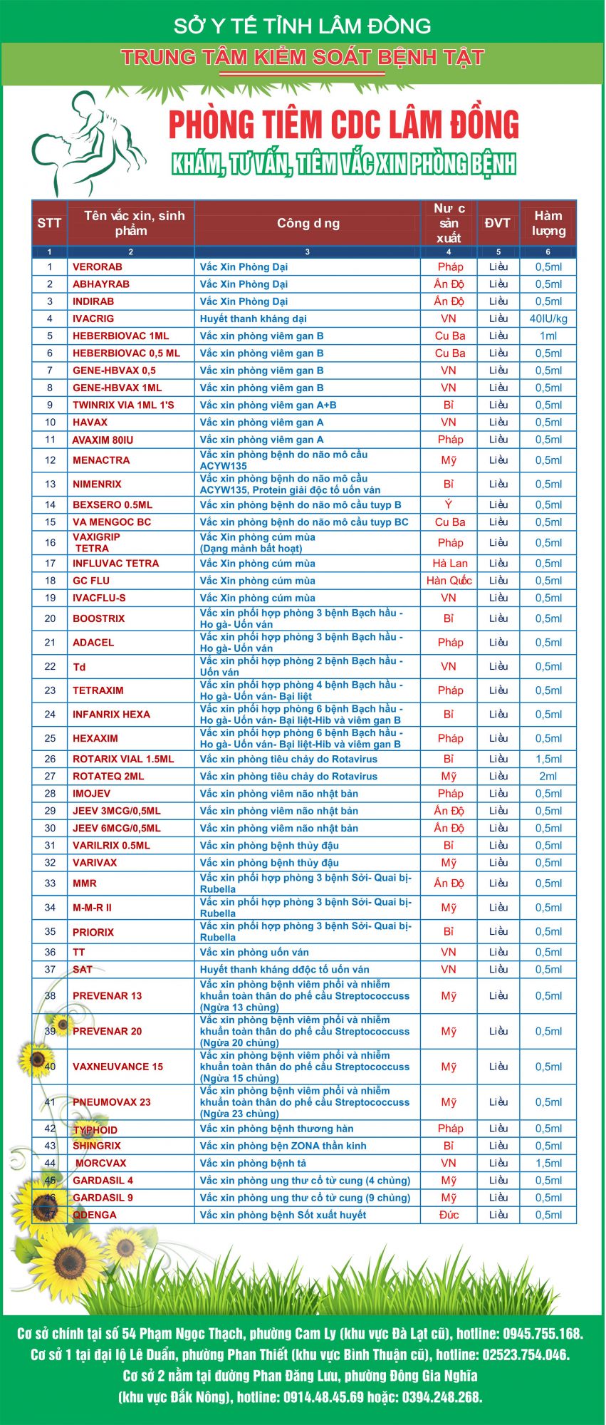 Hãy liên hệ với Phòng tiêm chủng Trung tâm Kiểm soát bệnh tật Lâm Đồng cơ sở gần nhất để được tư vấn và lịch tiêm chủng phù hợp!!!