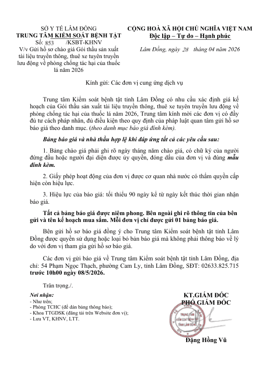 Gửi hồ sơ chào giá Gói thầu sản xuất tài liệu truyền thông, thuê xe tuyên truyền lưu động về phòng chống tác hại của thuốc lá năm 2026 Ngày đăng: 28/04/2026 - 09:34 Chia sẻ: | In bài viết