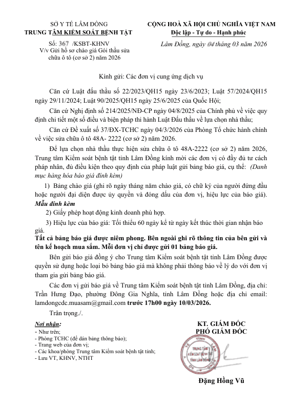 Cập nhật lúc: 16:27 - 04/03/2026 Gửi hồ sơ chào giá Gói thầu sửa chữa ô tô (cơ sở 2) năm 2026 | Giới thiệu
