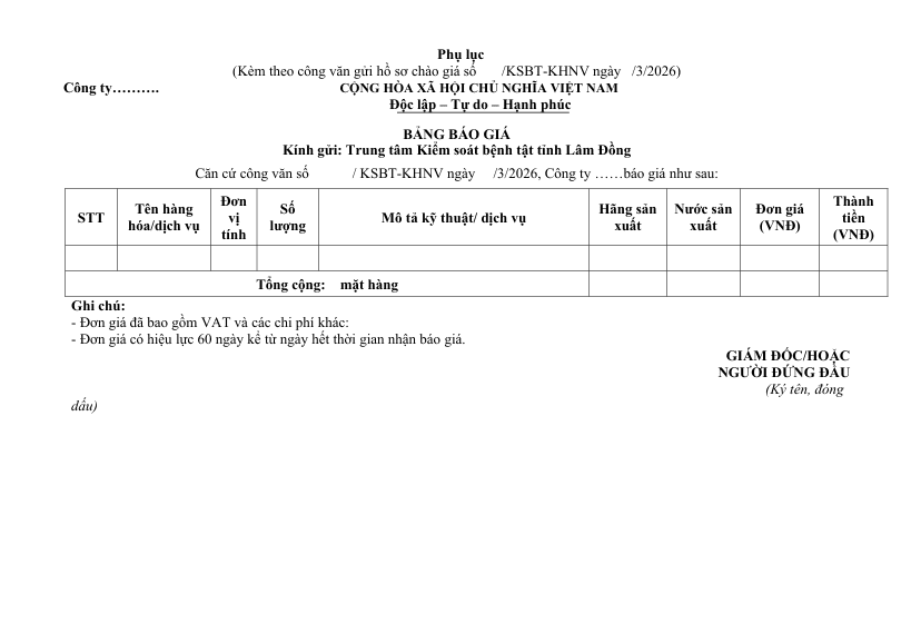 Thông báo Gói thầu: Mua vật tư, sinh phẩm, hóa chất, môi trường Quý I/2026 của Trung tâm kiểm soát bệnh tật tỉnh Lâm Đồng.