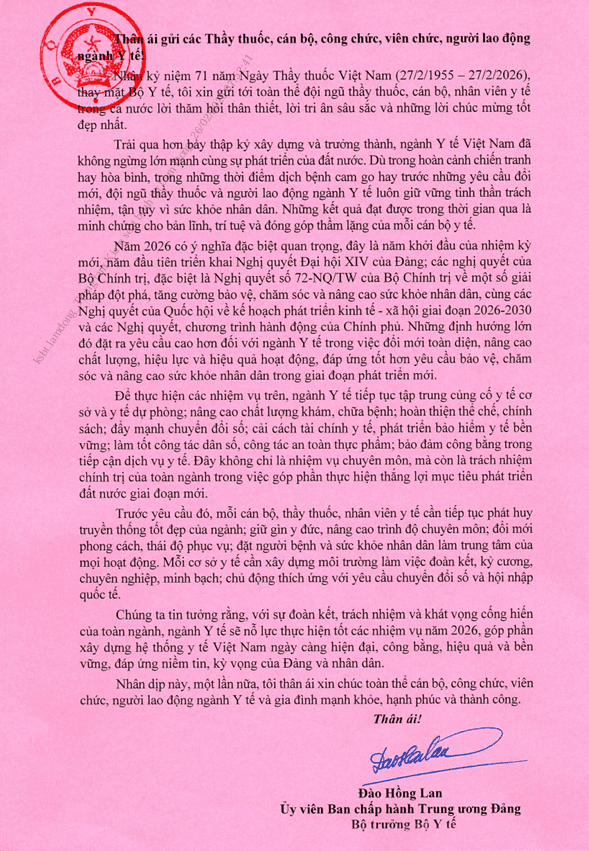 Thân ái gửi cac Thầy thuốc, cán bộ, công chức, viên chức, người lao động ngành Y tế! Ngày đăng: 26/02/2026 - 09:09 Chia sẻ: | In bài viết